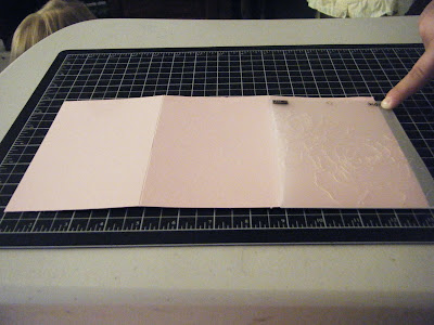 This card was brayered in Pretty in Pink and then run through the Big Shot with the Manhattan Folder. I then sanded the top of the embossed image, allowing the white cardstock core to show through. I then layer the top of the card with the vellum embosslit flower and Regal Rose scalloped border.